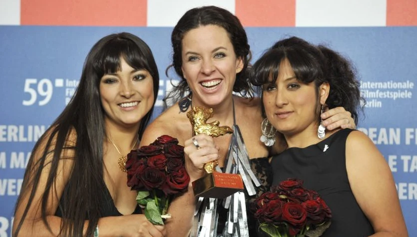Claudia Llosa (w środku) - reżyserka "La teta asustada" ("Mleko smutku") ze Złotym Niedźwiedziem i aktorkami swego filmuAFP