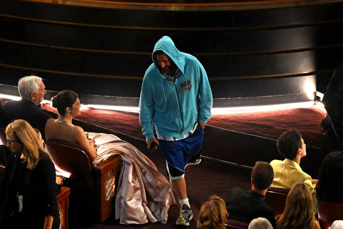 Adam Sandler postawił na luźny ubiór - mężczyzna założył niebieską bluzę z kapturem i spodenki. Jego kontrastujący wygląd szybko przyciągnął uwagę innych gości, w tym prowadzącego.