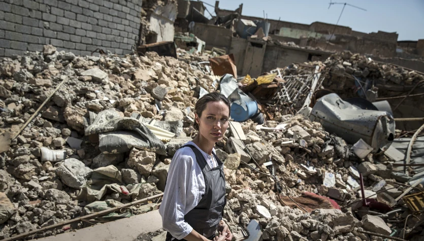 Na zdjęciu: Angelina Jolie wśród ruin budynków w Mosulu w Iraku w 2018 roku, fot. Andrew McConnell / UNHCR brakGetty Images