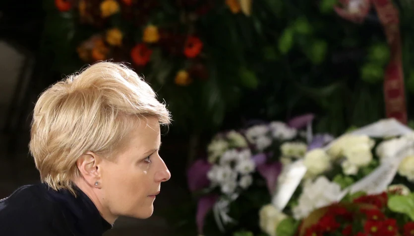 Aktorka Joanna Koroniewska (C) podczas uroczystości pogrzebowych Witolda Pyrkosza.Tomasz Gzell PAP