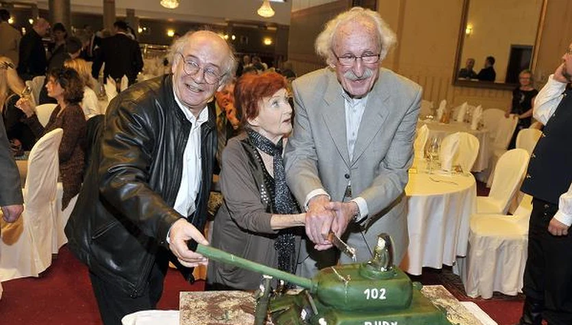 Po latach, w 2013 roku przy okazji benefisu Franciszka Pieczki, bohaterowie serialu "Czterej pancerni pies" spotkali się i wspólnie pokroili tort w ksztłacie... czołgu. Na zdjęciu: Włodzimierz Press, Barbara Krafftówna i Franciszek Pieczka.AKPA